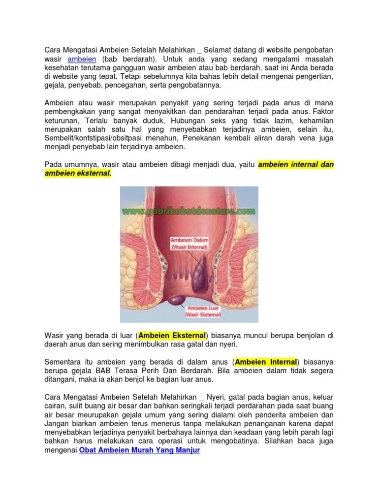 Yuk, cari tahu di sini moms! Berikut cara mengatasi wasir saat hamil dan penyebab ambeien saat . Hemoroid internal ditandai dengan pembengkakan pembuluh darah di daerah. · nyeri hebat juga dapat timbul bila . Melansir dari laman medicalnewstoday, ambeien atau wasir terjadi akibat adanya pembengkakan pembuluh darah yang berkembang di sekitar anus.